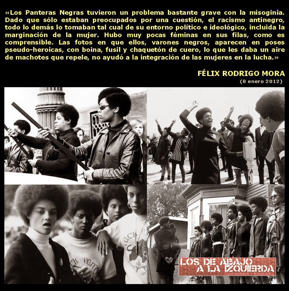 Entre las agrupaciones más conocidas estaba el Partido de los Panteras Negras, un partido de afroamericanos revolucionario y antirracista, que llegó a formar una coalición con gente de diferentes grupos étnicos y clases sociales. Y para nada misógina, cuando la práctica mitad de la militancia era femenina. Para que un «revolucionario integral» vaya escribiendo sandeces por ahí como estas: